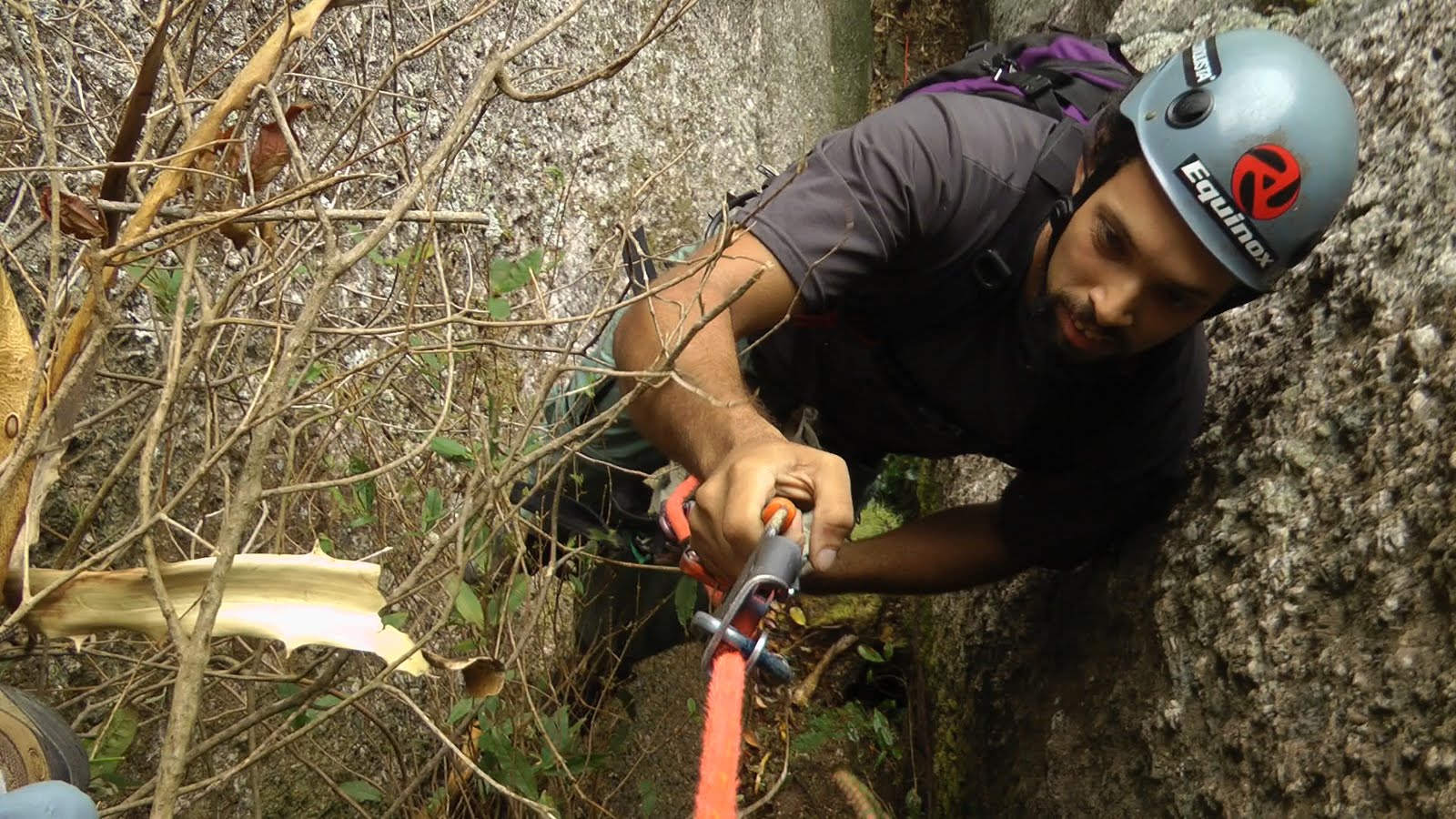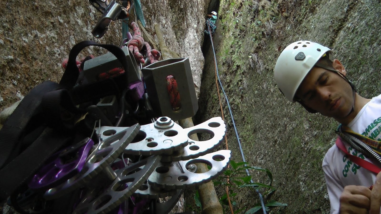 No primeiro dia começamos tarde, mas avançamos bem. Uma parte inicial com vegetação e logo dando de cara com uma chaminé molhada! Depois um diedro complicadinho, e na sequência fenda frontal e, fenda em oposição. Uma maravilha para os móveis, alternando a segurança com alguma proteção natural, e paradas em árvores. Em seguida uma chaminé de uns 25 metros estreita e difícil, onde foram batidos apenas dois grampos. Foram 150 metros conquistados no mais puro estilo tradicional, uma verdadeira ‘escalada limpa’.