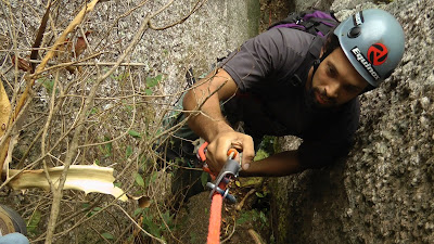 A missão então era só de subir a montanha para trocar as cordas e buscar os equipos que estavam na parede. Coisa simples e aparentemente rápida, se não fosse a tempestade que desabou sobre nós! Já tomei muita chuva na cabeça estando na montanha, mas confesso que naquela montanha, devido ao local em específico que estávamos, em formato de canaleta, algo começou a preocupar, pois as chaminés se transformaram em verdadeiras cachoeiras. Uma cena bonita de se ver, mas derepente de longe, e não estando dentro delas! Tudo molhou completamente, sujou, ralou e rasgou, enquando nos debandávamos corda abaixo, afim de saírmos o mais rápido da montanha, até porque havia o prenúncio de tempestade elétrica. E na base chegamos imundos e encharcados, mas com a tarefa finalizada e então já rindo dos contratempos. É preciso saber extrair boas vivências até de momentos perrengosos, pois isso acumula em experiências, que só são realmente compreendidas por aqueles que se lançam nos ambientes de montanha. E assim vamos seguindo, escalando e sorrindo, até porque a montanha a ser conquistada é a: Pedra Alegre.