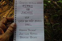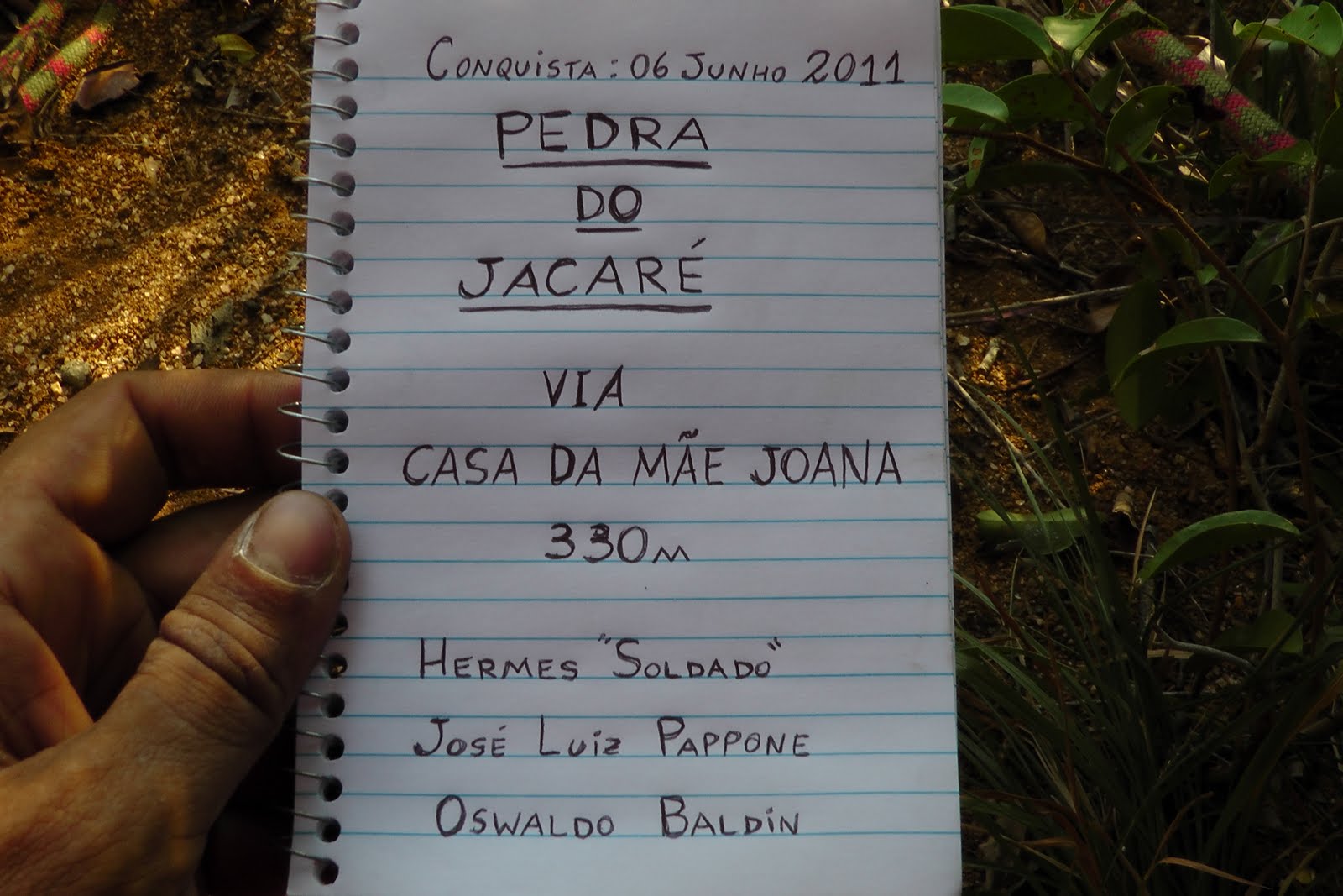 Encaixado em uma árvore, deixamos o livro de cume, registrando a conquista dessa montanha que ainda não tinha nome. Mas depois de muito a observar, percebemos que todo o conjunto montanhoso que a forma parece com a cabeça de um Jacaré, e assim em conversas com o pessoal local, a batizamos de Pedra do Jacaré. E a via ganhou o nome de “Casa da Mãe Joana”, em homenagem a Dona Joana, que com seu filho Fabinho, sempre recebe os escaladores de uma forma muito acolhedora em seu sítio.