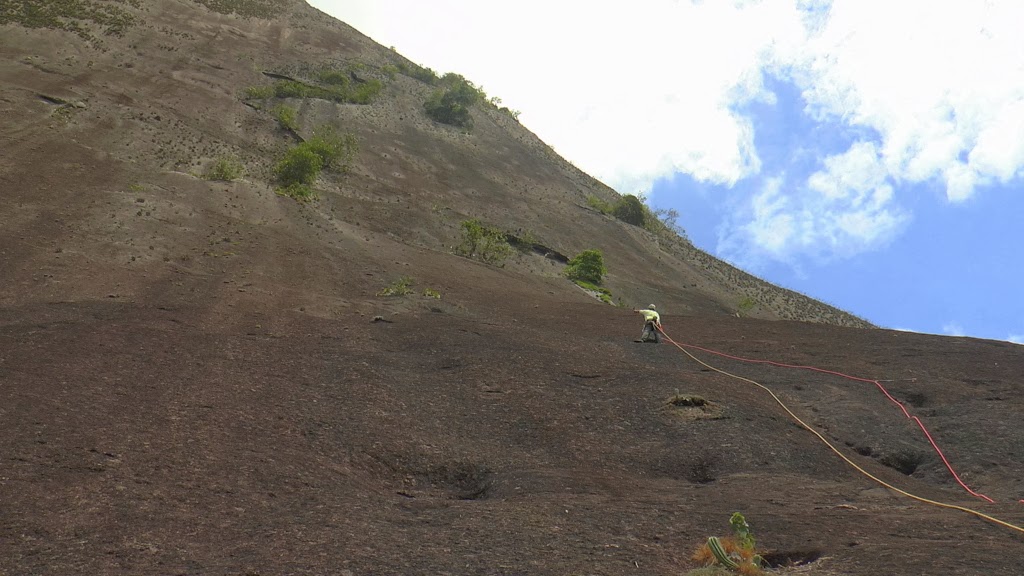 A linha escolhida resumidamente se divide em três partes: a primeira em ‘escalada de face’ (agarras, cristais, proteção fixa), uma parte central que é a tal já citada e caracterizada pela ‘escalada de aventura’, e uma ultima parte no testão final, aparentemente igual ao início.