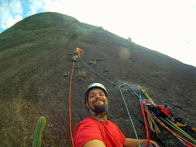 Planejamos, trocamos uma porrada de emails alinhando o que levar tentando minimizar as tralhas, e lá fomos nós rumo à Pancas no ultimo feriado de Proclamação da República. Fui na frente com o Soldado na quarta, para agilizar de repetir as três primeiras enfiadas e rebocar o Tonin até a P3, para assim agilizar os três próximos dias de conquistas com a chegada do Sandro na quinta. Enchemos o menino com 50 litros de água, e puxamos ele trilha acima quinem um cachorro na coleira. Contamos com a ajuda do Fabinho, nosso anfitrião de sempre, e de mais um conterrâneo que abriu uma trilha melhor pra gente.
