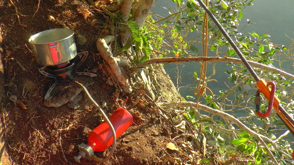 O sabadão amanheceu bonito, ensolarado e radiante, bom pra colocar as roupas no varal. Tomamos café – sempre cozinhando num pequeno e desajeitado platô – e fomos subir pelas cordas fixas. Era chegada a hora de enfrentar a verdadeiro a cereja do bolo do Jungle Fight. Troquei o magnésio por um par de luvas, que seriam muito mais eficazes pra varar mato acima. No trecho rolaram duas fendinhas para proteger em móvel, mas o que imperava era a vegetação. Eeeeita vegetação! Chegando no final da enfiada fui presenteado com mordidas de cupins, e a finalizei num platô com arvores de porte considerável, muito boas. Estava  eu lá de boa, me livrando dos cupins, e eis que comecei ouvir gritos e xingamentos vindos debaixo, descobrindo que fodi com a vida do Soldado, que lutou para passar com o mochilão dentro do emaranhado que fiz por entre os galhos.