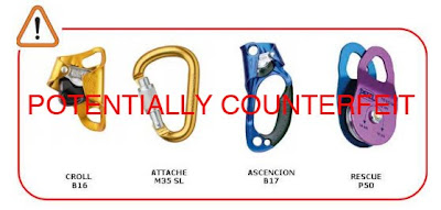 A Petzl recentemente descobriu que cópias idênticas de alguns de seus produtos estão sendo fabricadas na China, com cargas de resistência muito inferiores às originais.
